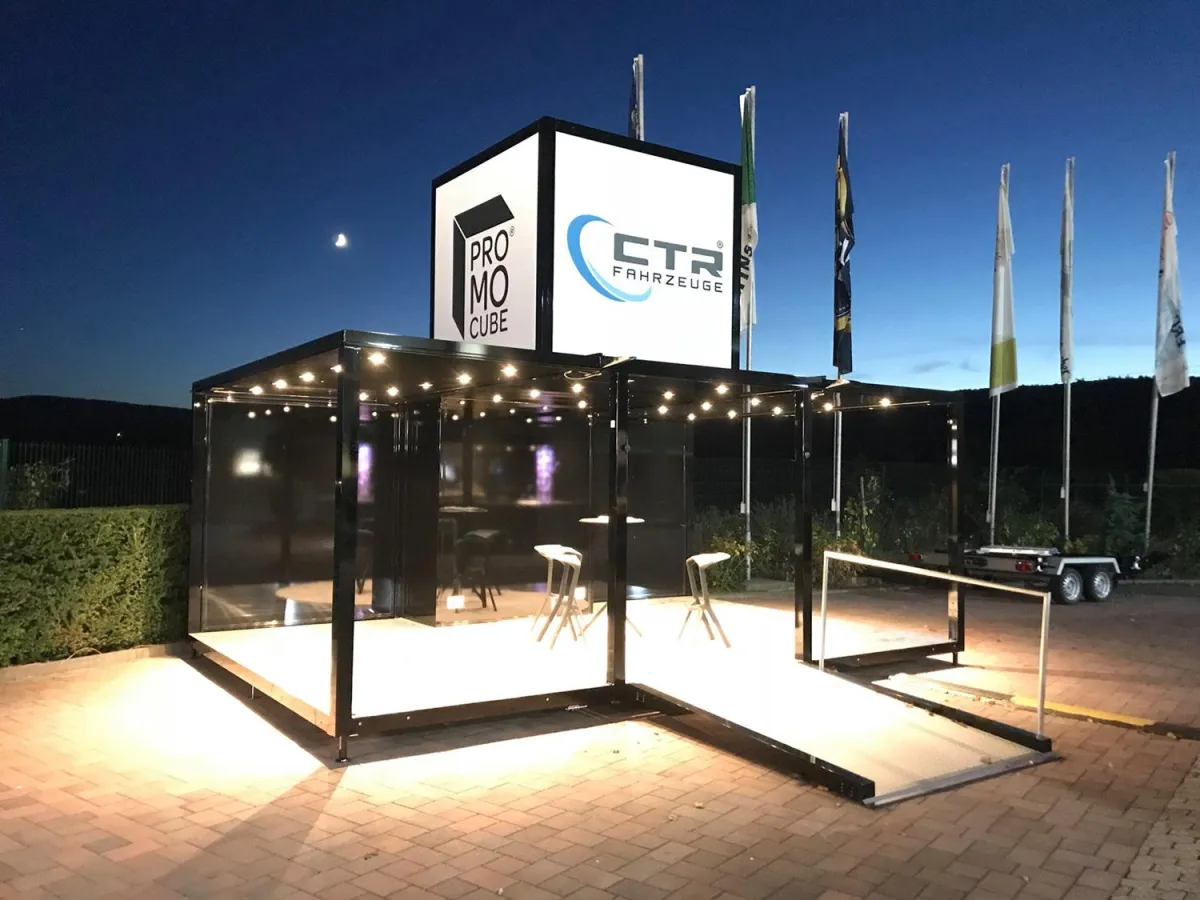 Böden, Decken und Wände werden einfach ausgeklappt, zusätzliche Hilfsmittel wie Kran oder Gabelstapler sind nicht notwendig. Gerne kümmert sich das Promocube-Team aber auch um Transportlogistik sowie Auf- und Abbau. „Das kubische, hochwertige Design und die Barrierefreiheit sind neben der Langlebigkeit Hauptmerkmale des Promocube®“, erklärt der Betriebsleiter der CTR Fahrzeugtechnik GmbH Mario Schichel.