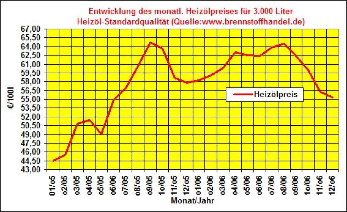 Im Dezember 2005 musste der Endverbraucher noch 1.734,90 € für 3.000 Liter Heizöl bezahlen. Damit verringerte sich der Heizölpreis innerhalb von 12 Monaten um 4,4% bzw. absolut um 76,80 €. Seit Januar 2005 war bisher der September 2005 mit einem Durchschnittspreis von 64,70€/100Liter (absolut:1941,00 Euro) bezogen auf eine Abnahmemenge von 3000 Litern Heizöl-Standardqualität der teuerste Monat für den Heizöleinkauf.