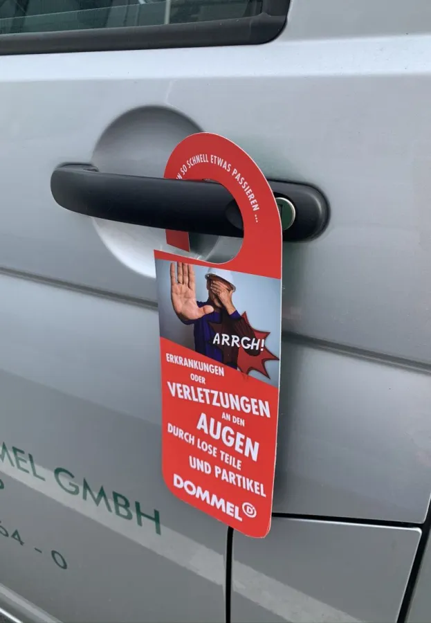 Zu einem guten Arbeitsschutzkonzept gehört auch, den Beschäftigten ein gewisses Bewusstsein für die Risiken und Gefahren zu vermitteln, denen sie im Berufsalltag ausgesetzt sind. Zusätzlich zu den üblichen Maßnahmen hat sich Dommel hier etwas Originelles einfallen lassen. "Um unsere Mitarbeiter regelmäßig auf bestimmte Themen aufmerksam zu machen, haben wir auffällige Türhänger drucken lassen. Diese werden den Kolonnen einmal im Monat - immer mit unterschiedlichen Themenschwerpunkten - an die Fahrzeuge gehängt", erklärt Benedikt Stentrup, Geschäftsführer der Sanierungstechnik Dommel GmbH. Von Hautschäden und Abstürzen über Augenverletzungen und Quetschungen bis hin zur Erste-Hilfe-Leistung stellen die Anhänger komplexe Themen einfach dar. Dabei macht die rote Seite auf die jeweilige Gefahr aufmerksam, die grüne Seite zeigt die entsprechenden Handlungsempfehlungen auf.