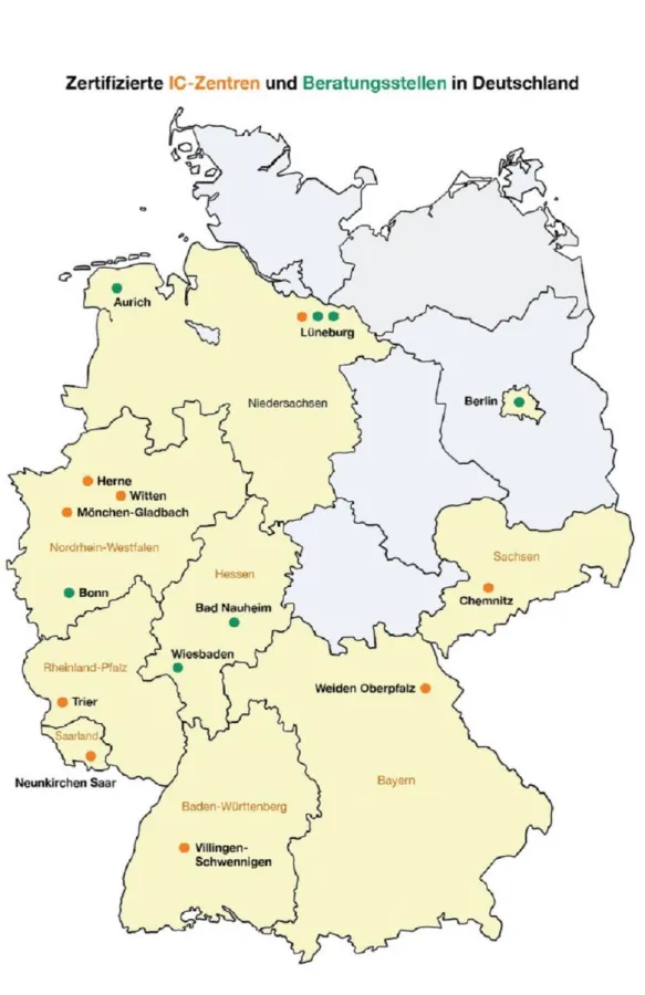 Zuletzt zertifizierte der ICA-Deutschland eine Beratungsstelle an der Asklepios Paulinen Klinik in Wiesbaden, womit das Versorgungsnetz nun insgesamt 16 geprüfte Anlaufstellen in den Bundesländern Berlin, Niedersachsen, Nordrhein-Westfalen, Hessen, Bayern, Baden-Württemberg, Rheinland-Pfalz, Sachsen und Saarland umfasst. Hinzu kommen zwei weitere IC-Zentren in Zürich.