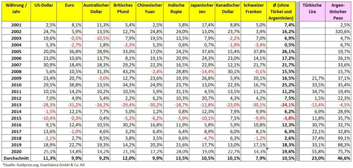 Tabelle: Wertentwicklung Gold in verschiedenen Währungen