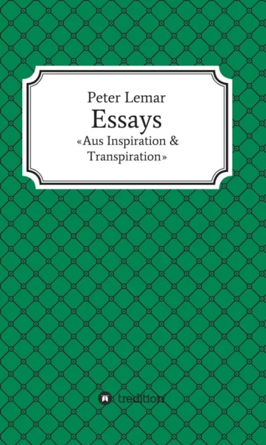 "Essays - Aus Inspiration & Transpiration" von Peter Lemar ist ab sofort im tredition Verlag oder alternativ unter der ISBN 978-3-347-25325-4 zu bestellen. Die tredition GmbH ist ein Hamburger Unternehmen, das Verlags- und Publikations-Dienstleistungen für Autoren, Verlage, Unternehmen und Self-Publishing-Dienstleister anbietet. tredition vertreibt für seine Kunden Bücher in allen gedruckten und digitalen Ausgabeformaten über alle Verkaufskanäle weltweit (stationärer Buchhandel, Online"Stores) mit Einsatz von professionellem Buch- und Leser-Marketing.