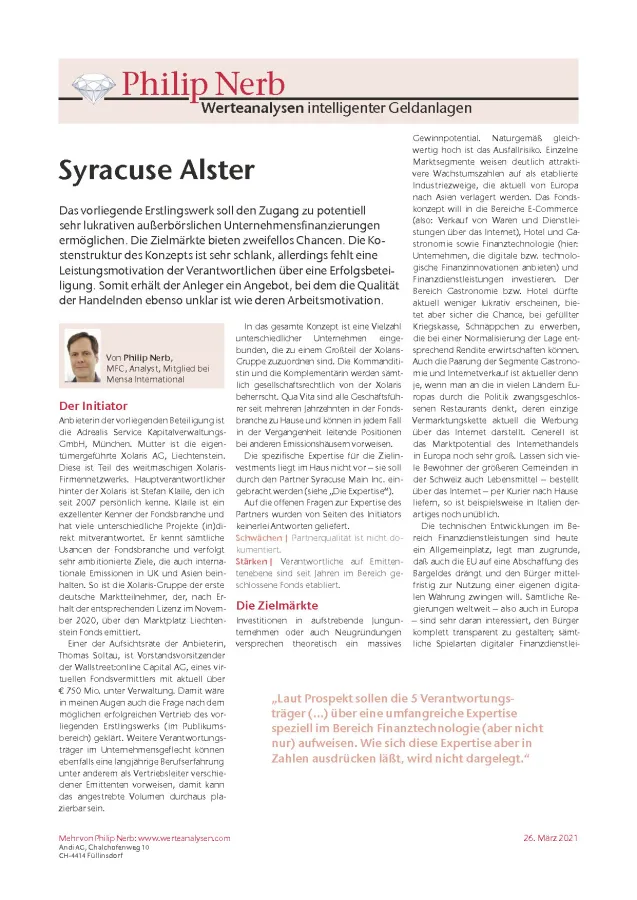 (openPR) Werteanalysen hat eine aktuelle Analyse zur Emission Syracuse Alster der Adrealis Service Kapitalverwaltungs-GmbH, München, veröffentlicht. Das Ergebnis fällt mit “mangelhaft” vernichtend aus.