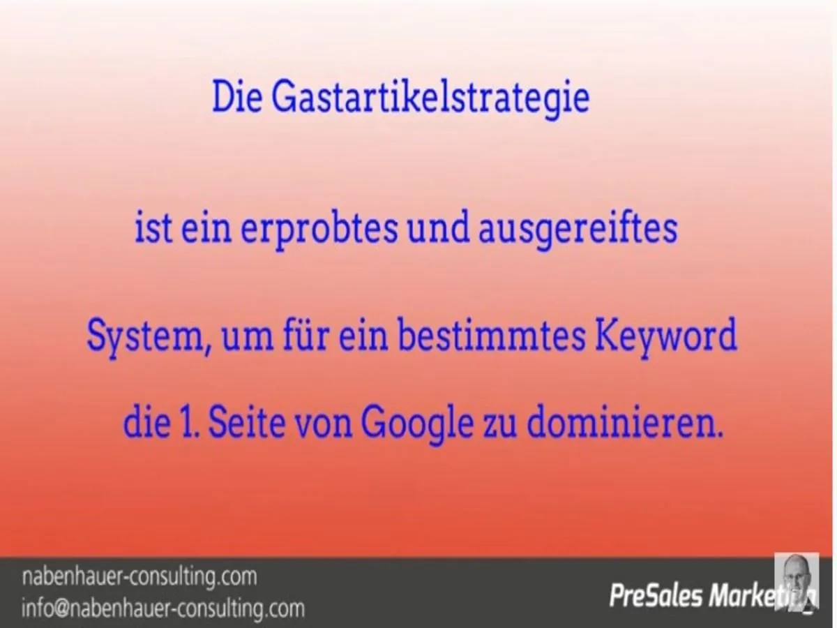 Die Gastartikelstrategie ist eine bewährte Methode, um die erste Seite von Google für ein Keyword zu dominieren. Gastartikel werden auf einer anderen Webseite veröffentlicht und verlinken von dort auf die eigene Webseite. Das ist ein wertvoller Backlink und Google belohnt Backlinks. Die Vorteile der Gastartikelstrategie liegen auf der Hand: es wird im Webinar absolut hochwertigen Content geboten, welcher so gut aufbereitet ist, dass die Kunden wirklich direkt im Anschluß für sich selbst umsetzen können. Zusätzlich erhält jeder im Webinaranwesende ein Leitfaden und Vorlagen zur Umsetzung der gezeigten Strategie.