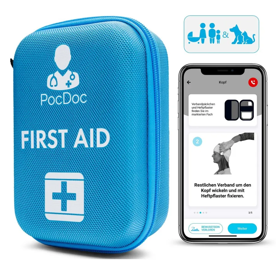 Das PocDoc-System bietet Ersthilfe-Maßnahmen nicht nur für Erwachsene, sondern speziell auch für Kinder und Säuglinge. Sogar Hunde und Katzen können mit PocDoc versorgt werden. Die App wurde zusammen mit Ärzten entwickelt und beinhaltet über 300 einzelne Behandlungsschritte. Sie ist für IOS und Android verfügbar. Das Case enthält alle notwendigen Materialien plus Zusatzkomponenten.