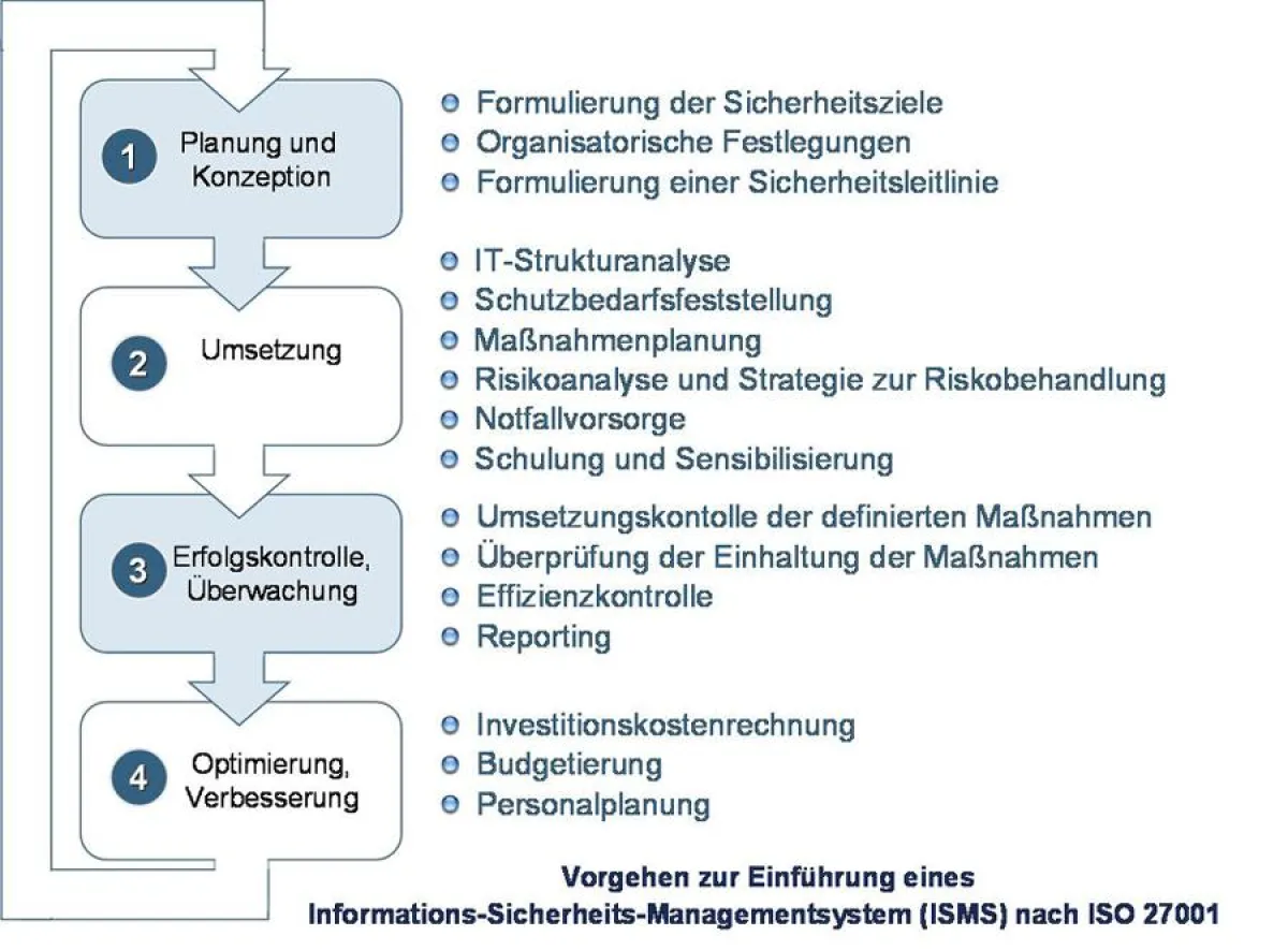 Eine umfassende, unternehmensweite Informationssicherheit, die auf eine dauerhafte Erfüllung der Anforderungen und nachhaltige Begrenzung der Risiken ausgerichtet ist, erfordert Managementinstrumente. Diese müssen die Planungs-, Realisierungs und die Betriebsprozesse effizient unterstützen. Ein weiterer entscheidender Baustein ist die kontinuierliche Verbesserung der Informationssicherheit.