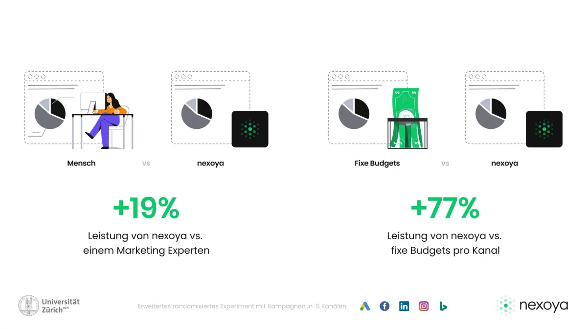 Forscher der Universität Zürich wollten herausfinden, ob und unter welchen Voraussetzungen KI-basierte Tools diese Aufgabe besser bewältigen als der Mensch. In Zusammenarbeit mit Flavia Wagner von nexoya wurde eine entsprechende Untersuchung durchgeführt. Das Start-up hat eine Plattform entwickelt, welche alle organischen und bezahlten Marketingkennzahlen sowie Drittdaten über das Wetter oder Wechselkurse bündelt. Auf diese Weise kann das Marketing die Leistung der einzelnen Kampagnen und Assets per Mausklick bewerten und vergleichen. Dank der automatisierten Optimierung von laufenden Kampagnen liefern KI-Algorithmen konkrete Vorschläge für die kanalübergreifende Budgetzuweisung.