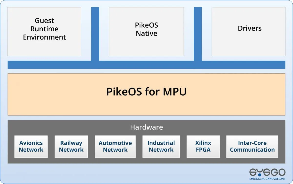 PikeOS for MPU benötigt keine MMU und ermöglicht somit einfachere Designs für Controller, wodurch es sich besonders für Anwendungen in der Industrie eignet, die ein sicheres deterministisches Verhalten erfordern. Es verwendet die gleichen Time- und Space-Partitionierungsmechanismen wie PikeOS Classic. Es gibt kein komplexes Task- und Adressmanagement, stattdessen kommt PikeOS for MPU mit nur einem Adressraum pro Ressourcenpartition aus, was PikeOS für MPU sehr nahe an die ursprüngliche ARINC 653 Spezifikation bringt. Damit eignet es sich auch für ein breites Spektrum an kritischen Anwendungen in der Raumfahrt und Avionik.