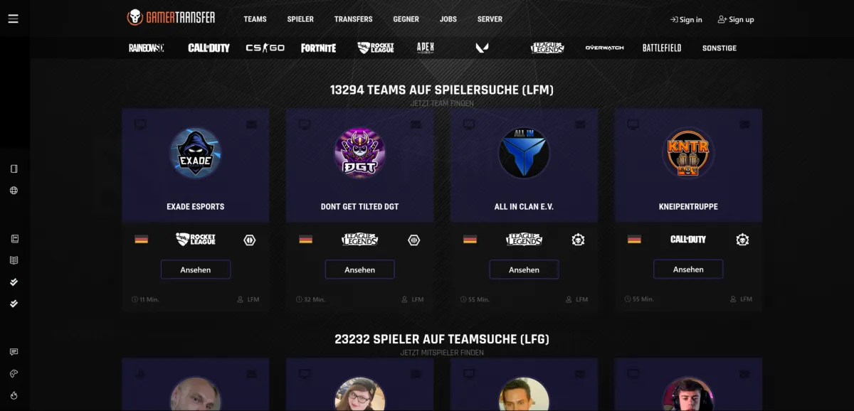 Auf der Webseite können Sie auch Teams oder Spieler zu Spielen wie Rainbow Six, Call of Duty, Fortnite, PUBG, Overwatch, Fifa19 oder Battlefield im Angebot von Gamertransfer.com finden.