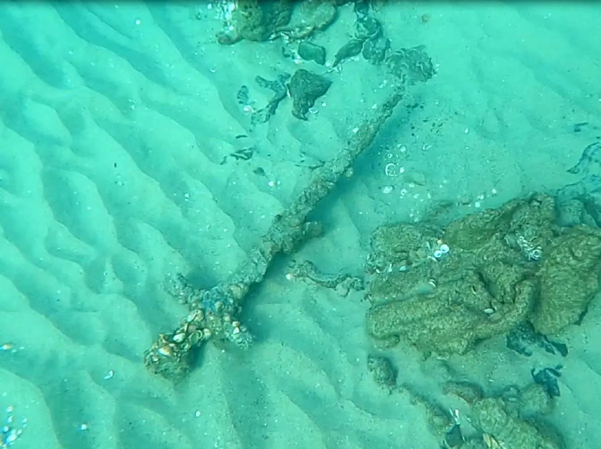 Ein meterlanges Schwert mit einem 30 Zentimeter langen Griff. Das Schwert und Keramikfragmente sowie antike Stein- und Metallanker wurden vermutlich durch Wellen und Unterströmungen freigelegt.