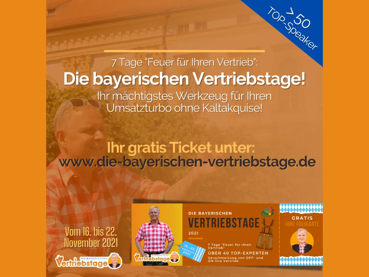 Nehmen Sie jetzt kostenlos teil und sicheren Sie sich alle Vorträge der über 50 Speaker während der bayerischen Vertriebstage (Online-Event) - Holen Sie sich jetzt Ihr kostenloses Ticket unter https://www.die-bayerischen-vertriebstage.de. Oder Sie klicken hier >>>