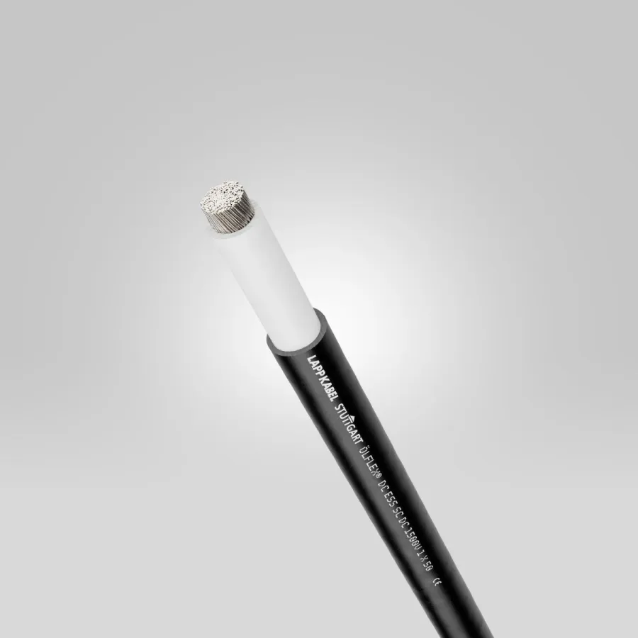 Bei der ÖLFLEX® DC ESS SC handelt es sich um eine halogenfreie, hoch flammwidrige Einzeladerleitung für Gleichstromanwendungen bis 1,5 kV insbesondere für den Einsatz in Energiespeichersystemen (ESS). Durch die Verwendung von elektronenstrahlvernetzten Polymer-Compounds sind die Isolier- und Mantelwerkstoffe der ÖLFLEX® DC ESS SC erhöht beständig gegen Öle, Kraftstoffe, Laugen und Säuren. Das begünstigt die Langlebigkeit der Leitung bei hohen Temperaturen oder bei hoher Strombelastung und sichert eine gute Spannungsfestigkeit und Kurzschlusstemperatur. Die Leitung ist auch extrem witterungsbeständig (bis ‑40 °C) und für den dauerhaften Einsatz im Freien geeignet, gleichgültig ob in trockenen, feuchten oder nassen Umgebungen. Zudem verfügt sie dank feindrähtigem flexiblem Leiteraufbau über besonders gute Verlegeeigenschaften. Die neue ÖLFLEX® DC ESS SC gibt es in Leiterquerschnitten bis 400 mm2 und eignet sich durch ihre sehr guten Eigenschaften im Brandfall auch für Installationen im Innenbereich, insbesondere in Energiespeichersystemen (ESS).