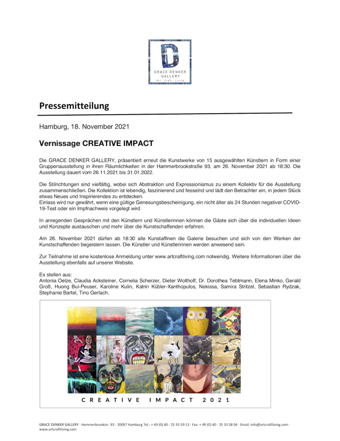 (openPR) Unter dem Motto CREATIVE IMPACT präsentiert Die GRACE DENKER GALLERY, erneut die Kunstwerke von 15 ausgewählten Künstlern in Form einer Gruppenausstellung in ihren Räumlichkeiten in der Hammerbrookstraße 93, am 26. November 2021 ab 18:30. Die Ausstellung dauert vom 26.11.2021 bis 31.01.2022.