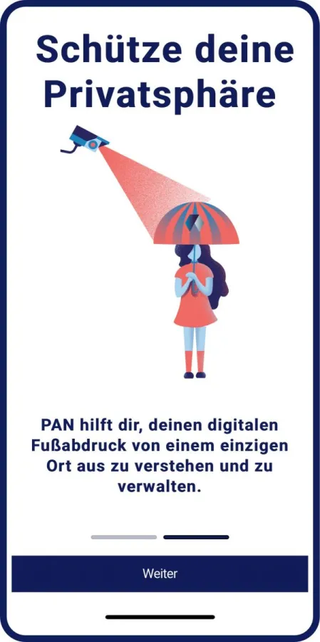 PAN Privacy ist eine einfache, aber leistungsstarke digitale Lösung für alle, die die Kontrolle über ihre persönlichen Daten zurückgewinnen wollen, indem sie den Einzelnen über die Bedingungen für die verantwortungsvolle Nutzung ihrer privaten Informationen entscheiden lassen. Das Kernstück der App ist der Privacy Score, der den Grad des Datenschutzes eines Nutzers anhand von unterschiedlichen Datenschutzeinstellungen und -parametern einer breiten Palette beliebter digitaler Dienste misst. Um seinen Privacy Score zu verbessern, erhält der Nutzer Empfehlungen, die er mit wenigen Klicks umsetzen kann.
