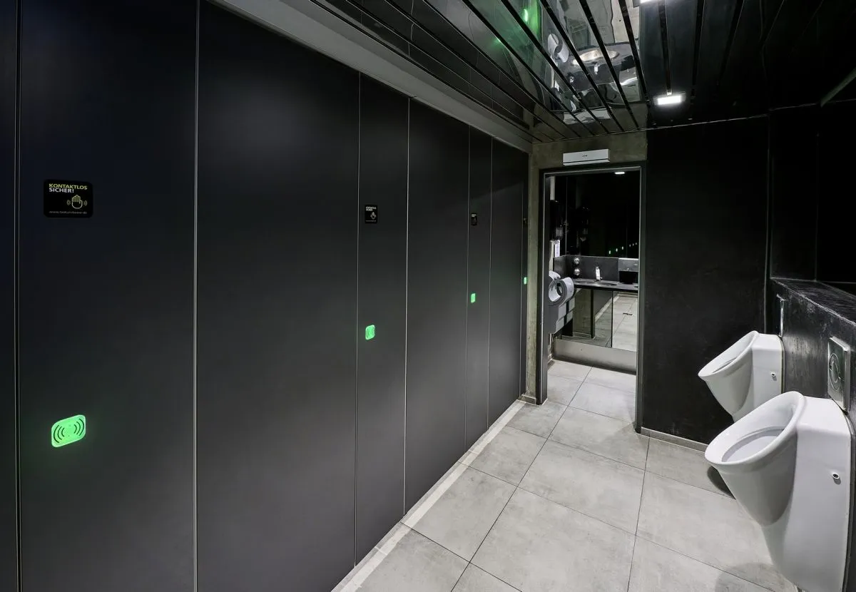 So entschieden sich die Verantwortlichen bei der Sanierung für eine Lösung der Schäfer Trennwandsysteme GmbH . Sie verhindert eine Schmierinfektion - die Übertragung von Viren über das Berühren von Oberflächen - über die Türen der WC-Kabinen. Denn diese sind mit moderner LED-Sensor-Technologie ausgestattet und ermöglichen dem Gast ein berührungsloses Öffnen und Schließen. Letzteres erfolgt mit einer einfachen Handbewegung vor dem Sensor, der auch für ein kontaktloses Ent- und Verriegeln der Tür sorgt. Besonderen Nutzerkomfort bietet die eingebaute LED-Anzeige, die durch grünes und rotes Licht anzeigt, ob eine Kabine frei oder besetzt ist. Ein Sensor erfasst zudem die Anzahl der Nutzer und signalisiert - nach einer vorab definierten Anzahl - den Reinigungsbedarf der Kabine. Bei einem Stromausfall entriegeln sich die Türen automatisch. Außerdem steht ein Serviceschlüssel zur Verfügung, mit dem sich in einer Notlage die Türen von außen öffnen lassen. Das System lässt sich mit unterschiedlichen Trennwandlösungen von Schäfer kombinieren. Dabei steht eine große Auswahl an Dekoren und Farben zur Wahl, sodass eine individuelle Gestaltung gegeben ist. Integriert ist Look & Wave hier in das Trennwandsystem EF-3. Es besteht aus robusten Sandwichelementen mit einer HPL-Oberfläche, welche reinigungsfreundlich und langlebig ist. Die Farbvariante Anthrazit mit Beschlägen in Alu eloxiert mutet modern und hochwertig an. Nach hinten zurückgesetzte Füße erzeugen einen schwebenden Eindruck - und sorgen zugleich dafür, dass die Reinigung effizient erfolgen kann.