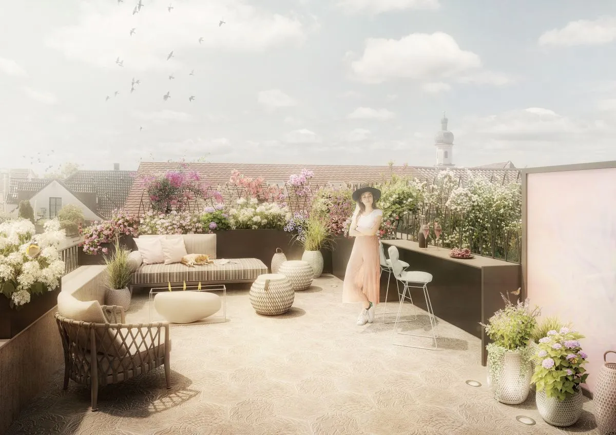 Der besondere Charme Grafings liegt in den alten, erhaltenen Giebelhäusern und dem historischen Marktplatz. Der Ort ist gelebte Geschichte, bereits 1040 erstmals urkundlich erwähnt. Das "S'Platzl" würdigt die traditionelle Architektur vor Ort und interpretiert typische Gestaltungselemente der alten Bauernhäuser wie üppige Blumenkästen zeitgemäß. So entsteht ein urbanes Ensemble zum Arbeiten, Einkaufen und Wohnen. Im Garten entsteht rund um die Skulptur "Balance of Nature" des Münchner Künstlers Hajo Forster mit einem blühenden Platzl inklusive Wildbienenhotel und einem Milli-Bankl ein beinahe dörfliches Miteinander.