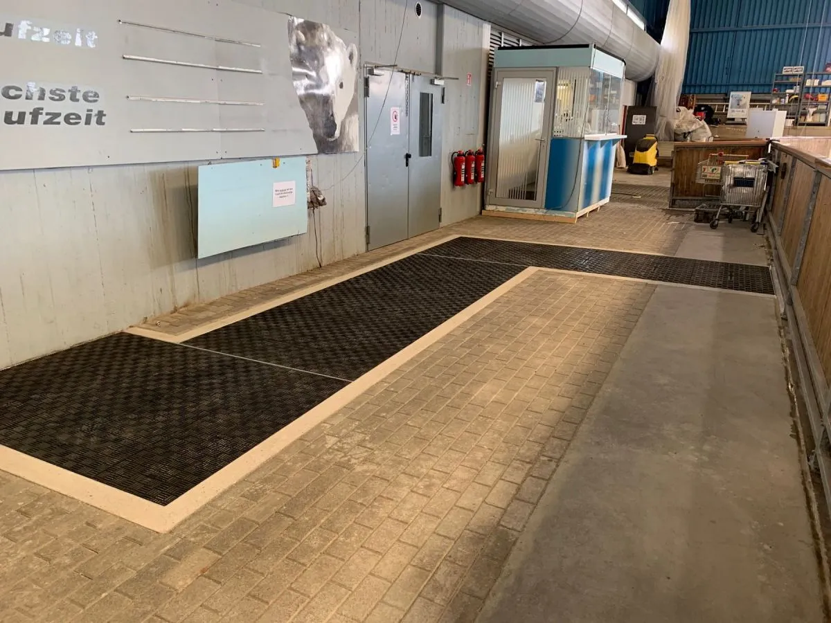 Für den Betrieb der Eisbahn sind zahlreiche Rohre und Leitungen nötig, die unter dem 1977 errichteten Gebäude zwischen der Anschlussstelle und der Eisfläche, partiell auch unter dem dazwischen liegenden Besucher-Gehweg, verlaufen. Bislang bedeckte eine schwere Betonplatte inklusive Pflasterung die Zugangsöffnung zu dieser unterirdischen Infrastruktur. Die massive Vorrichtung war jedoch besonders unhandlich: So musste bei Wartungsarbeiten und Kontrollen das Pflaster stets aufgenommen und die Betonplatte ausgehoben werden. Um dies zu vereinfachen, war eine deutlich leichtere Abdeckung gefragt, die mit maximal zwei Personen geöffnet werden kann. Zudem sollte sie mit einem Gewicht von bis zu 12 Tonnen sicher befahrbar sein. Grund: Der betroffene Bereich muss auch von der hauseigenen Eisbearbeitungsmaschine befahrbar sein. Das Elektrofahrzeug erreicht bereits unbeladen ein hohes Eigengewicht. "Sollte das Fahrzeug einmal defekt sein, ist es im schlimmsten Fall mit Schnee und Eis befüllt und damit deutlich schwerer - und auch dann führt der Weg über die Fläche über den Anschlussleitungen, die zur Piste führen. Bei der Auswahl der Abdeckung mussten wir diesen Aspekt also berücksichtigen", erklärt Andreas Grimm, verantwortlicher Projektleiter für diese Baumaßnahme.
