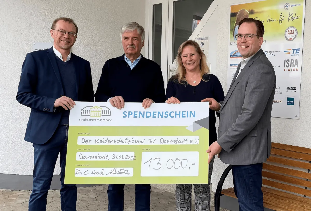 Am 31.03.2022 übergibt das Schulzentrum Marienhöhe in Darmstadt Spenden in Höhe von 13.000 Euro an den Bezirksverband Darmstadt e.V. des Kinderschutzbundes. Die Spenden sammelten Schülerinnen und Schüler sowie Lehrkräfte und Eltern des Schulzentrum Marienhöhe in Darmstadt. Am 05.10.2021 fand hierfür ein Sponsorenlauf mit Runden à 800 m auf dem Schulcampus statt. Seit über 40 Jahren veranstaltet das Schulzentrum mit Grundschule, Realschule, Gymnasium und Internat Spendenaktionen für den guten Zweck. Der Sponsorenlauf wird seit über 10 Jahren durchgeführt und unterstützt Projekte im In- und Ausland mit den "erlaufenen" Spenden.