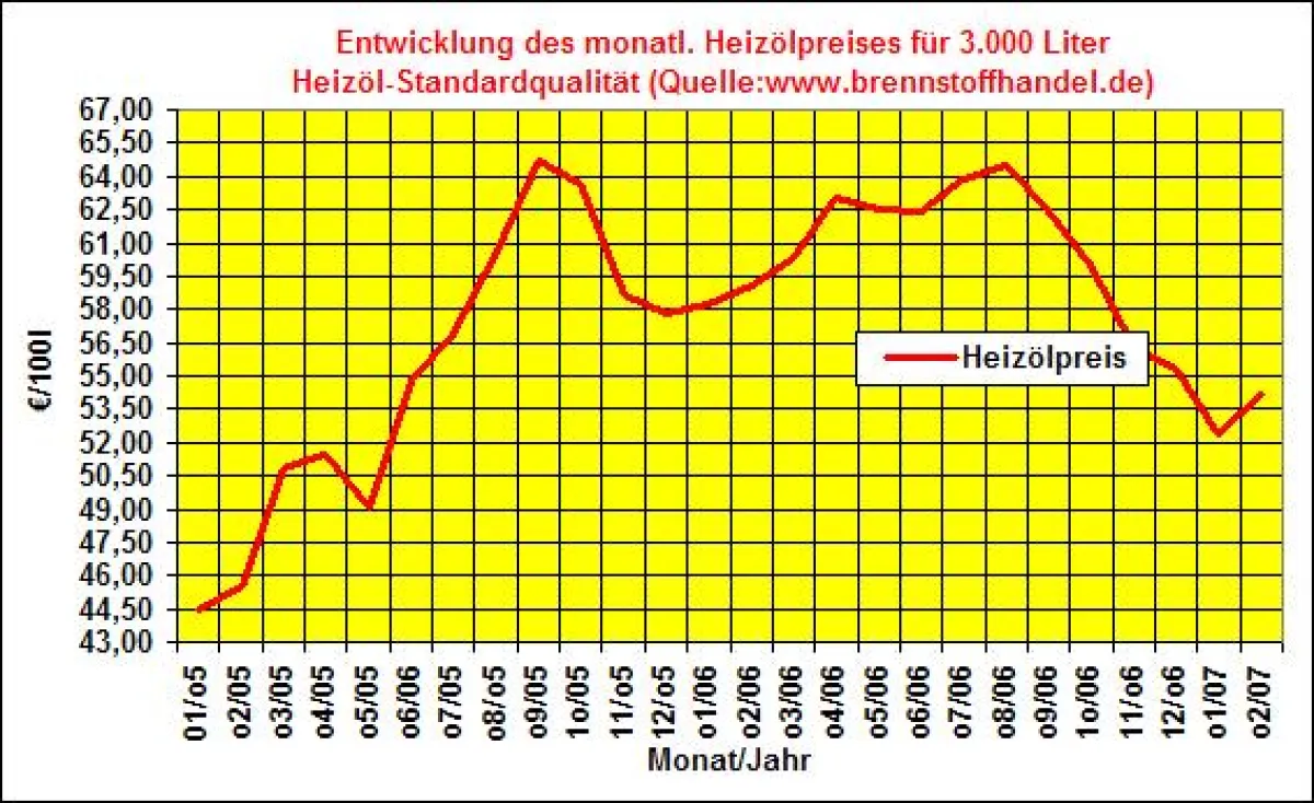 Seit Januar 2005 war bisher der September 2005 mit einem Durchschnittspreis von 64,70€/100Liter (absolut:1941,00 Euro) bezogen auf eine Abnahmemenge von 3000 Litern Heizöl-Standardqualität der teuerste Monat für den Heizöleinkauf.