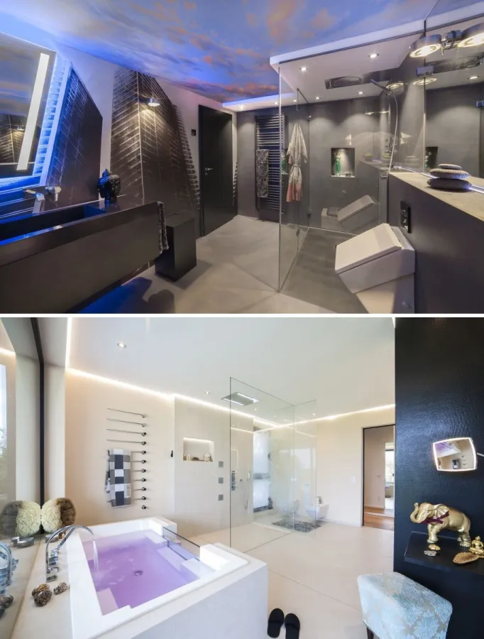 Ausgestattet ist das Bad mit einer Glasdusche in Opti-White, also ohne Grünstich in der Optik. Die Duschtasse wurde exakt auf Maß gefertigt. Für das individuelle Wohlfühlerlebnis sorgt die Kopfbrause mit verschiedenen Regenszenarien. Illuminiert wird das Bad über die Himmelsdecke sowie Up- und Down-Strahler mit einem raffinierten Lichterspiel. Zusätzlich visuell betont wird das frische und emotionale Ambiente durch die Wet-Tapete mit stylischen Skylinern im New Yorker Lifestyle. Die elektrischen Komponenten des Keller- bzw. Jugendbades sind komplett per Smart-Home gesteuert.