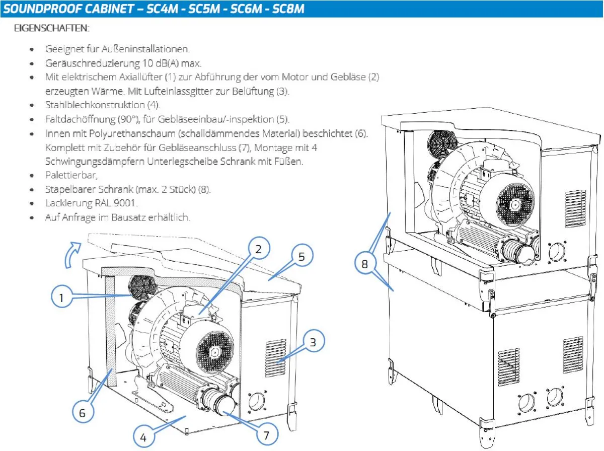 Diese Lautstärken können reduziert werden. Dazu werden die Seitenkanalverdichter in Schallschutzhauben eingehaust. Die neuen Schallschutzhauben der SKVTechnik haben folgende Produkteigenschaften: