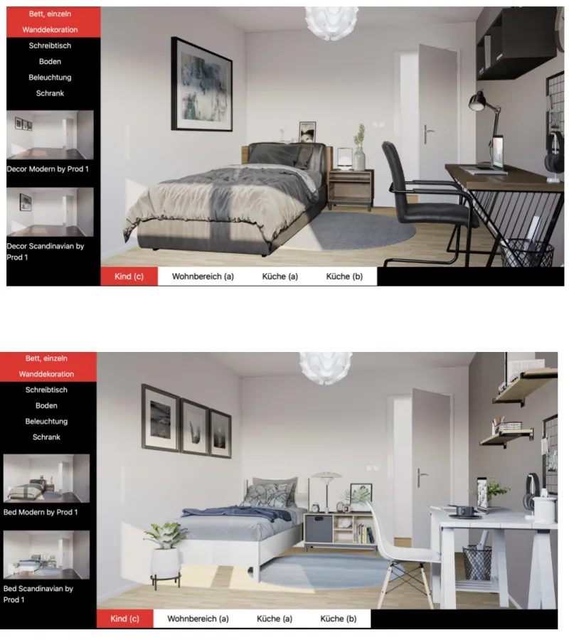 So können zum einen die Etagen leer und unmöbliert betrachtet werden, mit unterschiedlichen Bodenbelägen zur Auswahl. Zum anderen können verschiedene Möblierungen angesehen und auch untereinander einzelne Möbelstücke kombiniert werden.