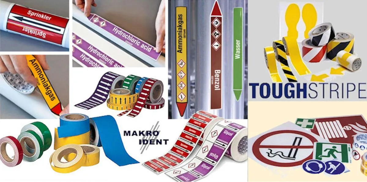 Für die visuelle Warnung gibt es verschiedene Absperrbänder, Warnaufsteller, Sperrpfosten mit Zubehör, wie auch Gefahrstoff-Etiketten. Für die Kennzeichnung von Rohren hat MAKRO IDENT ein überaus großes Sortiment. Neben der deutschen Norm DIN 2403 sind im Standard-Programm auch ISO 14726 für die Marine erhältlich.