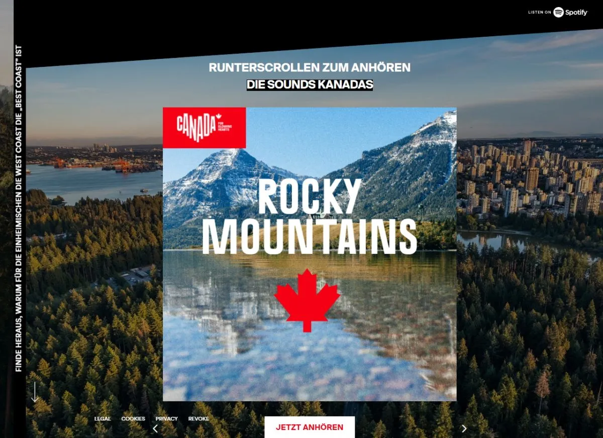 Das Konzept ist so neu wie Aufsehen erregend: Gehen User bei Spotify auf den Podcast-Bereich von Destination Canada, landen sie auf einer Microsite, die eine Übersicht über die Hör-Erlebnisse des Ahornlands bietet. Gewählt werden kann dort zwischen den beiden Optionen "Turn it up" und "Take a breath" und den dazugehörigen Podcasts und Playlists.