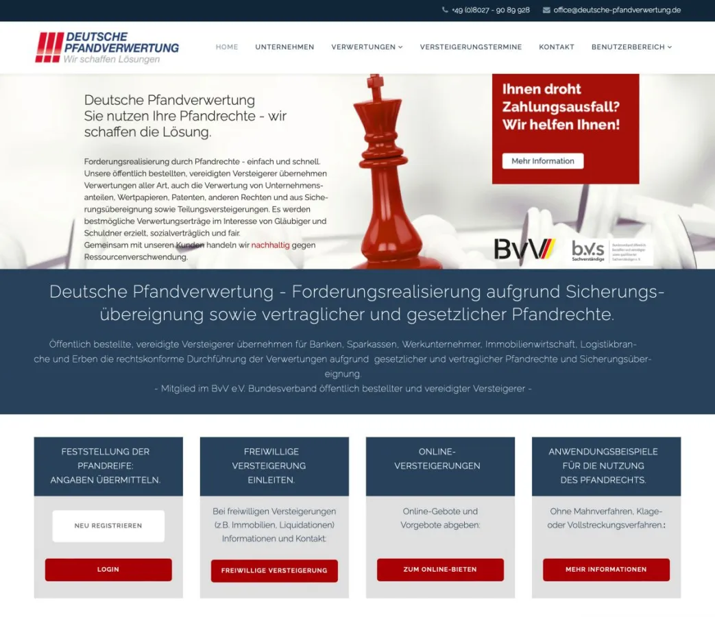 Deutsche Pfandverwertung Ostermayer & Dr. Gold GbR ist als führender deutscher Dienstleister für die Verwertung von vertraglichen und gesetzlichen Pfandrechten deutschlandweit tätig. Das Unternehmen wird von öffentlich bestellten, vereidigten Versteigerern betrieben, die von Gesetzes wegen zur Durchführung einer Öffentlichen Versteigerung befugt sind. Wir bieten die einfache und schnelle Alternative zur Umsetzung der Forderungsrealisierung mittels der Pfandrechtsverwertung aller Art. Bei der Verwertung akquirieren wir auch international, um einen größtmöglichen Käuferkreis zu erreichen. Unsere Auftraggeber sind Kreditinstitute, Unternehmer, die öffentliche Hand, Insolvenzverwalter, Rechtsanwälte, Immobiliengesellschaften, Speditionen, Logistiker, Unternehmen, Erben und Privatpersonen.