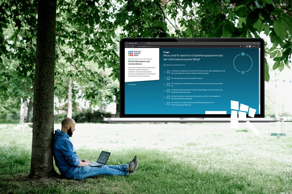 Mit dem #DigitalCheckNRW können Nutzer*innen herausfinden, wie fit sie im Umgang mit digitalen Medien sind. Neben dem Ergebnis liefert der Online -Test passende Weiterbildungsangebote - vor Ort oder auch online. Der #DigitalCheckNRW ist ein einfach zugänglicher und kostenloser Selbsttest im Internet. Er hilft, eigenes Wissen rund um digitale Medien zu verorten und passende Weiterbildungen zu finden.