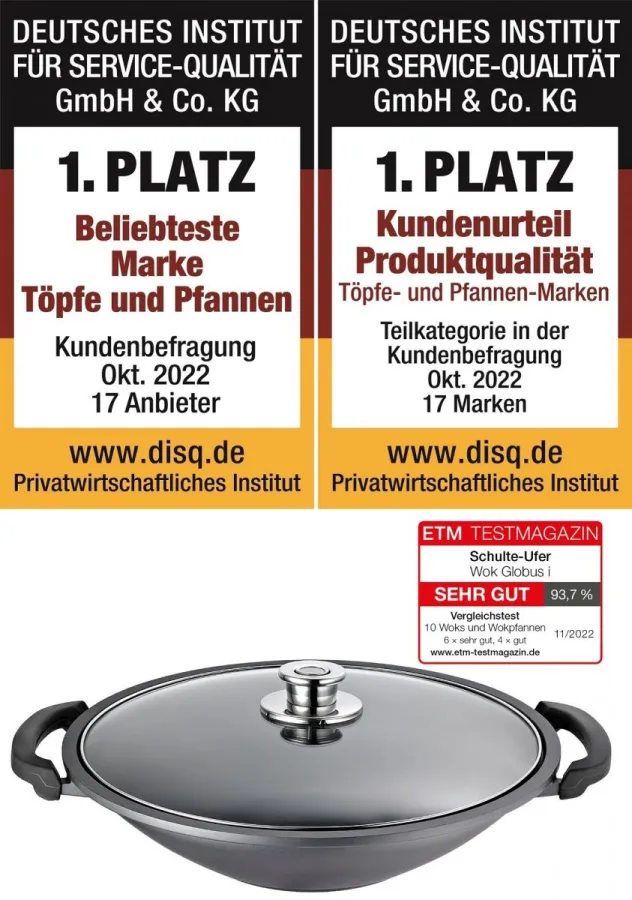 Der Name Schulte-Ufer steht bereits seit 1886 für langlebige, hochwertige Küchengeräte, die praktische Lösungen mit herausragender Qualität für höchste Ansprüche verbinden. Seit jeher sind die Produkte des Hauses einzigartig, immer auf dem neuesten Stand der Technik und zeitlos schön. Sie vereinen Lifestyle und Verbraucherwünsche mit Gegenwarts- und Zukunftsthemen. Wie überzeugend diese Unternehmensphilosophie ist, wird durch das DISQ-Umfrageergebnis erneut nachdrücklich bestätigt. Auch weitere Auszeichnungen von unabhängigen Instituten unterstreichen dies. Erst im Juni 2022 sprach die WirtschaftsWoche, das führende deutsche Wirtschaftsmagazin, die "höchste Empfehlung" aus für Schulte-Ufer. Das Unternehmen geht immer wieder als Sieger aus Kundenbefragungen hervor, die auf Basis von Verbrauchermeinungen zustande kommen und somit auf wertvollen, weil praxiserprobten Bewertungen von Kunden beruhen. Im Herbst letzten Jahres zeichnete das renommierte Wirtschaftsmagazin Focus Money das Unternehmen bereits zum dritten Mal in Folge mit dem Deutschlandtest-Siegel "Preissieger 2021" in Gold aus. Im Sommer letzten Jahres wurde Schulte-Ufer zum "Kundenliebling 2021" in Gold im Segment "Zuhause und Wohnen" gekürt. Drei Mal hintereinander wurde Schulte-Ufer als "Top Küchen Marke" ausgezeichnet und belegte bei Funktionalität und Handhabung den 1. Platz. Auch einzelne Produkte werden immer wieder ausgezeichnet wie die Bratpfanne Industar, die beim großen Pfannentest der Stiftung Warentest als Testsieger hervorging, oder der Wok Globus i, der soeben vom ETM Testmagazin mit "sehr gut" bewertet wurde.