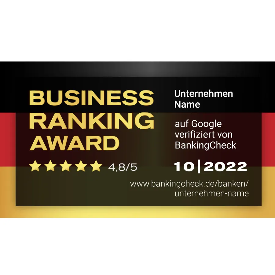 Stichtag für die Erhebung zum Business Ranking Award 2022 ist der 1. Oktober 2022. Die besten Anbieter der Finanz- und Versicherungsbranche werden mit dem Siegel Business Ranking Award auf Google ausgezeichnet und auf dem BankingCheck Portal referenziert und dokumentiert.