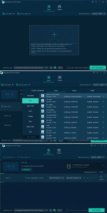 Gestartete BD-DVD Ripper von VideoByte kann den Blu-ray/DVD-Kopierschutz einfach umgehen und ihn in MP4 konvertieren, wodurch die Blu-ray-/DVD-Anzeigefreiheit realisiert wird.