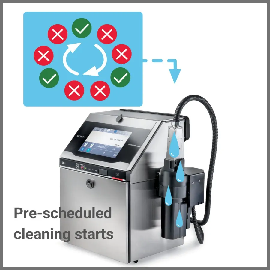 Die Safe Clean Funktion dazu bei, den Reinigungsaufwand des Druckers zu minimieren. Sie ermöglicht es dem Benutzer, den Drucker schnell und einfach zu reinigen, ohne dass es zu längeren Unterbrechungen in der Produktion kommt. Dies spart nicht nur Zeit, sondern auch Ressourcen, da weniger Solvent und benötigt wird