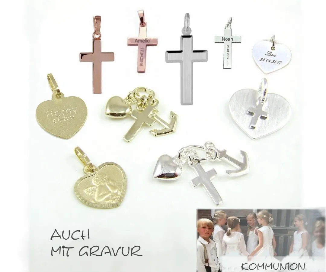 Zum festlichen Outfit darf natürlich auch Schmuck nicht fehlen. Eine besonders schöne Idee: Kommunionschmuck mit persönlicher Gravur, der dem Kommunionkind morgens als Geschenk überreicht wird und während der Erstkommunion mit gesegnet wird. So kann der Schmuck das Kind stets an die Erstkommunion erinnern und ein Leben lang als Glücksbringer begleiten.