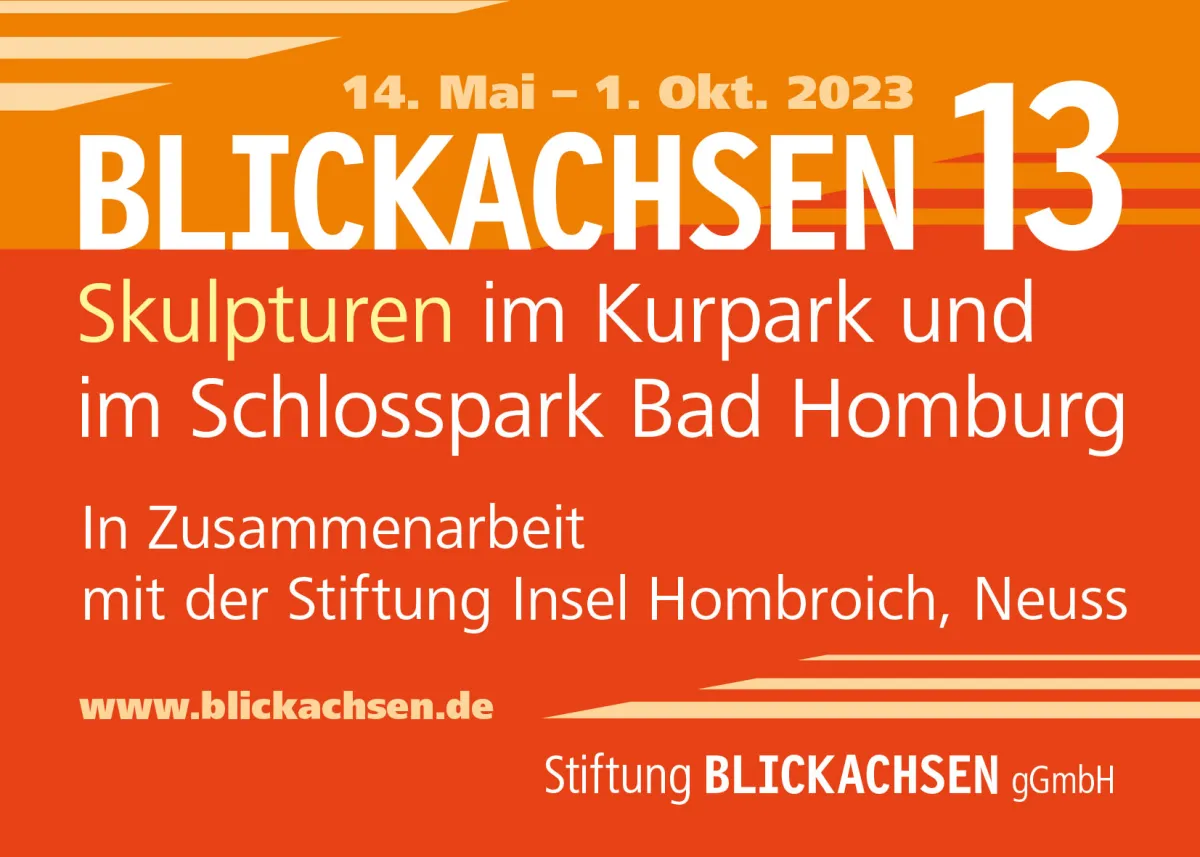 Blickachsen 13 wird sich auf die beiden ausgedehnten und abwechslungsreichen Ausstellungsareale am Hauptstandort der Biennale konzentrieren: den Lennéschen Kurpark und den landgräflichen Schlosspark in Bad Homburg. Wie gewohnt, werden zeitgenössische Skulpturen und Installationen behutsam in den historischen Parkanlagen positioniert, sodass sie miteinander und mit der umgebenden Natur kommunizieren und von Mai bis Oktober im Wechsel der Licht- und Vegetationsverhältnisse unterschiedlich erlebt werden können.