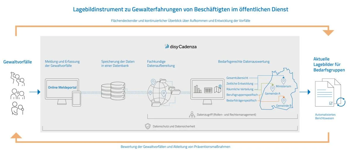 Für dieses Lagebildinstrument konzipiert Disy Informationssysteme (Disy) als erfahrener Digitalisierungspartner der öffentlichen Verwaltung die softwareseitigen Grundlagen. Auf Basis von disy Cadenza , der Software für Business & Location Intelligence, wird ein nutzerfreundliches Meldeportal entwickelt, in dem sich Gewaltvorfälle schnell und unkompliziert erfassen lassen. Auf der zentralen Meldedatenbank können dann Datenanalysen zur Deliktverteilung in verschiedenen Dimensionen (Deliktarten, Berufsgruppen, u.a.), zur räumlichen Verteilung und zeitlichen Entwicklung durchgeführt werden. Für die verschiedenen Nutzergruppen sollen Dashboards für spezifische Informationsbedarfe entwickelt werden, die sich flexibel der aktuellen Datenlage anpassen. Mithilfe der Reporting-Funktionen von disy Cadenza lassen sich zudem automatisiert aktuelle Lagebilder an die zuständigen Stellen versenden. Sie beschreiben kompakt die aktuelle Situation und weisen auf Auffälligkeiten hin.
