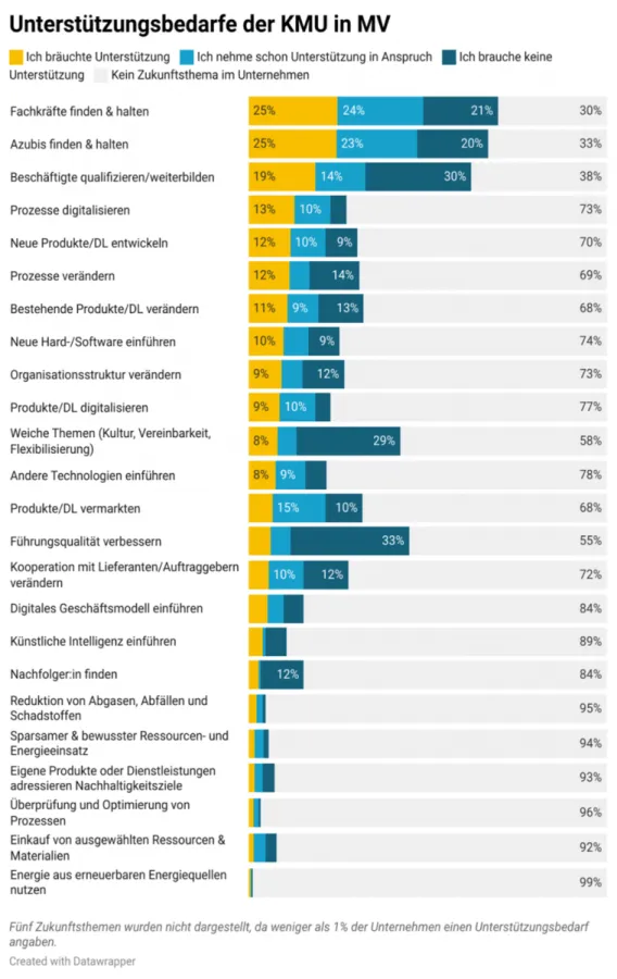 Den Großteil der Unternehmen (72%) beschäftigte Zukunftsthemen, die einen Bezug zu Menschen aufweisen. Fachkräfte und Auszubildende zu finden, zu halten und Personal weiterzubilden, waren hierbei die häufigsten Themen. Auch die entsprechenden Unterstützungsbedarfe wiesen die höchsten Werte auf: So wünschte sich jedes vierte Unternehmen Unterstützung beim Finden und Halten von Personal. Mit der Erhebung wurden erstmalig Unternehmen danach befragt, inwieweit sie Zukunftsthemen verfolgen, die im Zusammenhang mit Nachhaltigkeit stehen. 35 % gaben an, ein solches Thema zu bearbeiten, wobei sich die konkrete Umsetzung in einer großen Vielfalt an Maßnahmen zeigte. Zukunftsthemen aus den anderen Bereichen wie "Digitalisierung & Technologien" oder "Strukturen & Prozesse" wurden jeweils von jedem dritten Unternehmen angegeben.