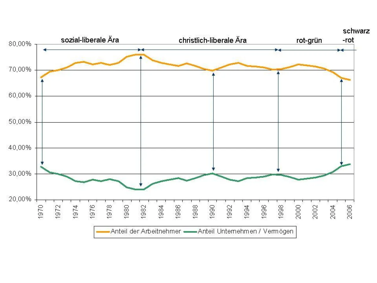 Die christlich-liberale Ära leitete einen Politikwechsel ein und versuchte ihrerseits die erfolgte Umverteilung umzukehren und auf den Ausgangspunkt von 1970 zurückzuführen. Um 1990 herum lag die Verteilung des realen Volkseinkommens wieder bei 70 : 30. Dann kam die Wiedervereinigung. Die politischen Realitäten erforderten eine Abkehr vom zunächst eingeschlagenen Kurs. 1994 lag die Verteilung bei rund 72 : 28, betrug aber schon vier Jahre später im Jahr 1998 wieder 70 : 30.