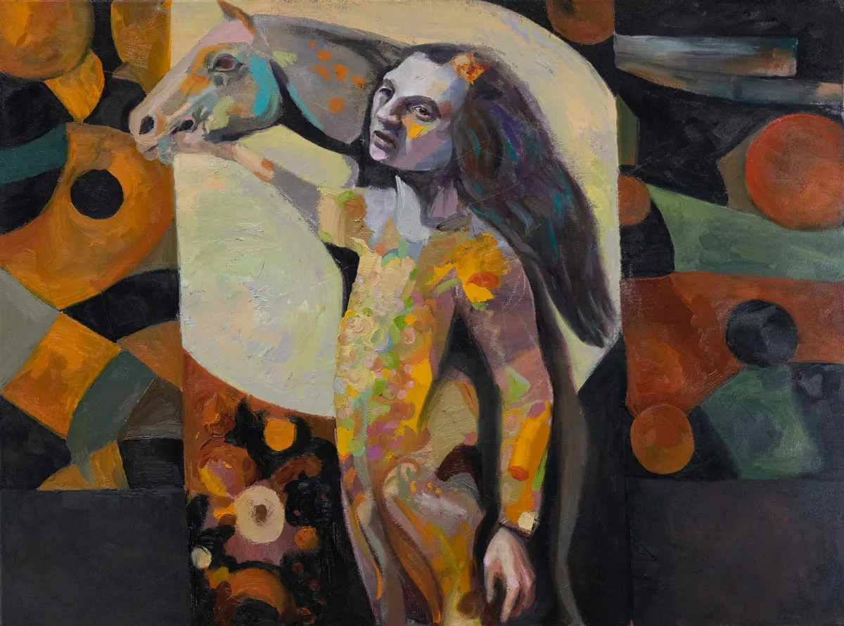 „Stroking a(n In)visible Horse“ – Das erste Werk der Serie entstand durch eine inspirierende Zusammenarbeit zwischen Künstler und Künstlicher Intelligenz Midjourney in Form eines 70 x 50cm großen Ölgemäldes auf Lienwand (Keilrahmen)
