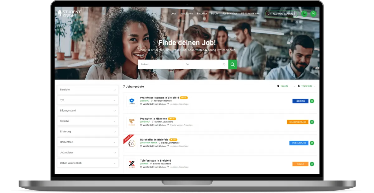 STUDENTKNIGHT ist ein Karriereportal & Jobportal. In der Jobbörse finden Bewerber & Kandidaten wie Studenten, Auszubildende, Praktikanten, Absolventen & Young Professionals Jobanzeigen für Jobs. Bewerber finden Stellenangebote im Stellenmarkt oder können sich als Kandidat im Talentpool vorstellen. Artikel, Tipps und Vorlagen werden bereit gestellt.