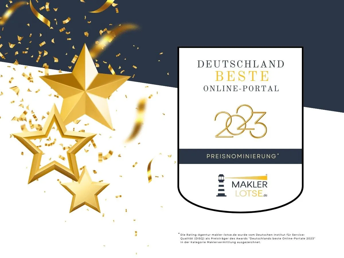 Bei einem aktuellen, unabhängigen Test der größten und bekanntesten Maklervermittlungsportale Deutschlands belegt das Online-Portal den zweiten Platz. Das renommierte deutsche Institut für Service-Qualität (DISQ) hat das Unternehmen in der Kategorie "Maklervermittlung" als Preisträger des Awards "Deutschlands beste Online-Portale 2023" ausgezeichnet. (Quelle: https://disq.de/2023/20230511-Online-Portale-Preis-Maklervermittlung.html)
