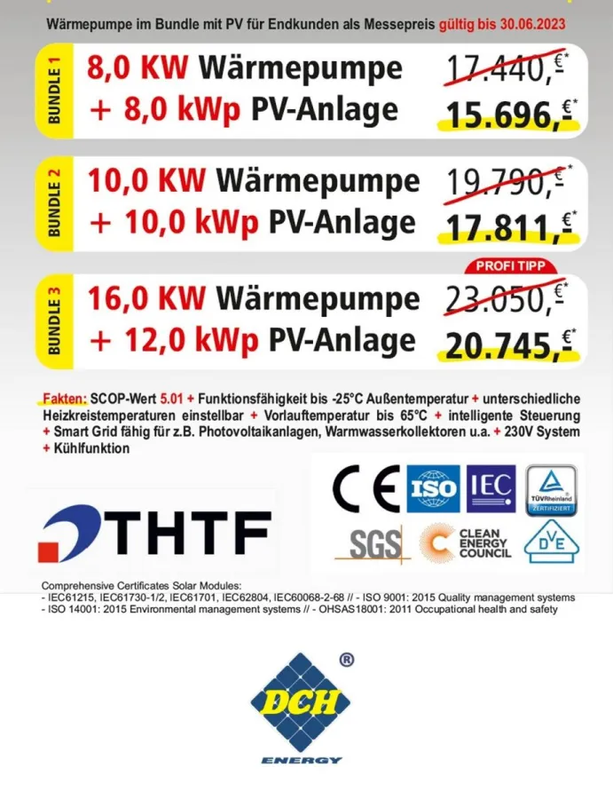 Ab sofort können Kunden bei DCH Energy moderne Wärmepumpen von 4,0 bis 16,0 KW im Paket mit passenden Photovoltaikanlagen mit bis zu 12 kWp erwerben. Das Angebot wird am Dienstag, 13.06.2023, auf der diesjährigen Intersolar Europe in München vorgestellt und gilt zu den Messekonditionen noch bis zum 30.06.2023.