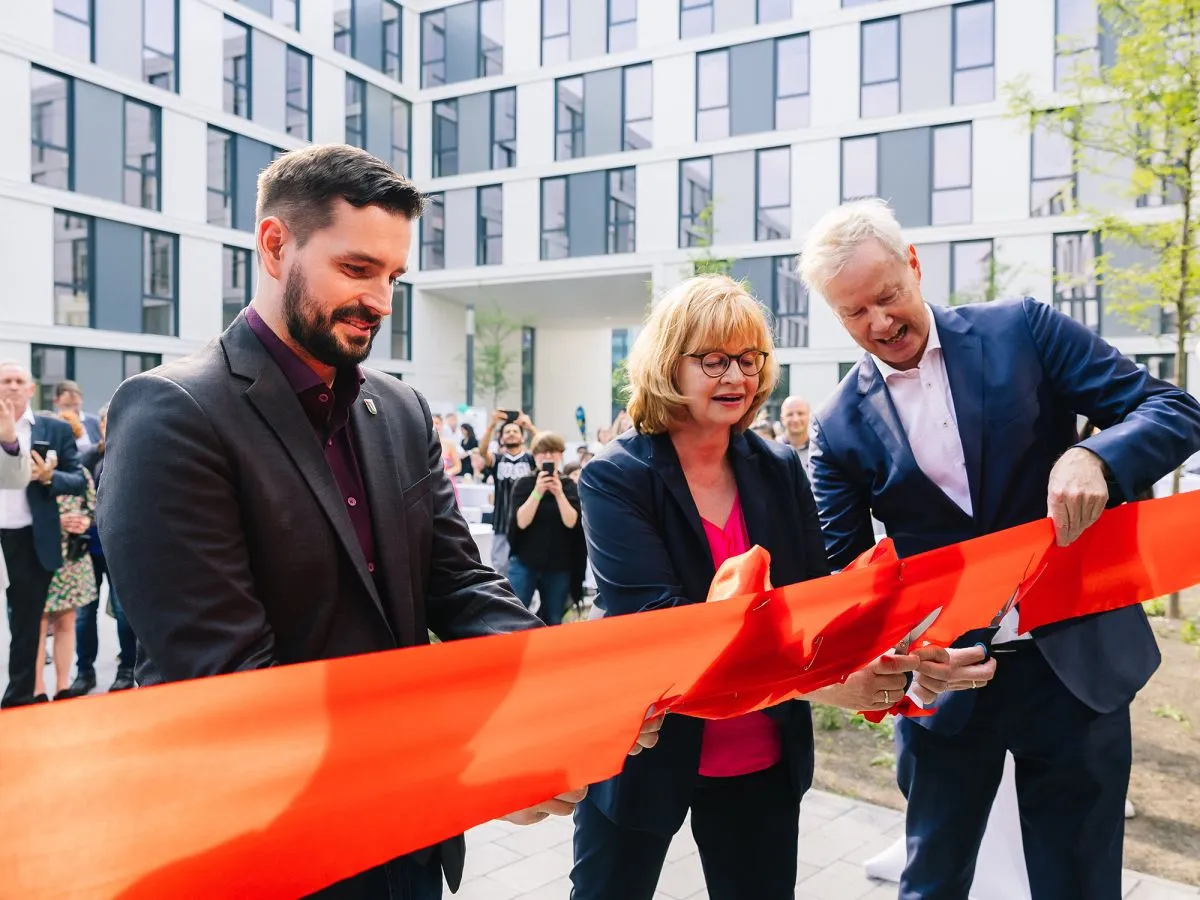 Christian Amsinck, der Vorsitzende des Kuratoriums der bbw Hochschule und Hauptgeschäftsführer der Unternehmensverbände Berlin-Brandenburg, eröffnete zusammen mit Marco Brauchmann, dem für Weiterbildung zuständigen Bezirksstadtrat von Treptow-Köpenick, und Ursula Schwill, der Kanzlerin der bbw Hochschule, den neuen Standort. Gemeinsam zerschnitten sie das symbolische rote Band und besiegelten so den offiziellen Neubeginn der Bildungseinrichtung in Adlershof.