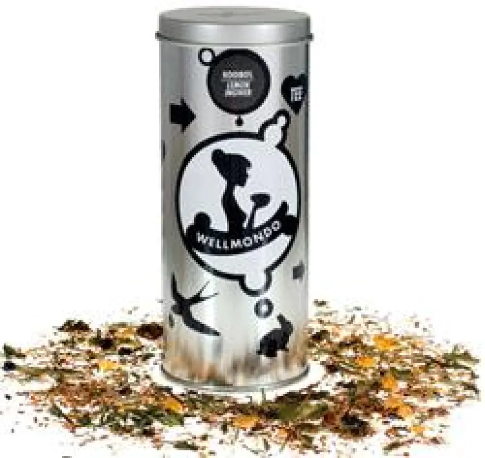 * Rooibos Lemon-Ingwer mit Catuaba, Korinthen, Lemongras, Nana-Minze, Holunderbeeren, Zitronenfruchtgranulat, Maracujafruchtgranulat, Eukalyptusblättern und Aroma