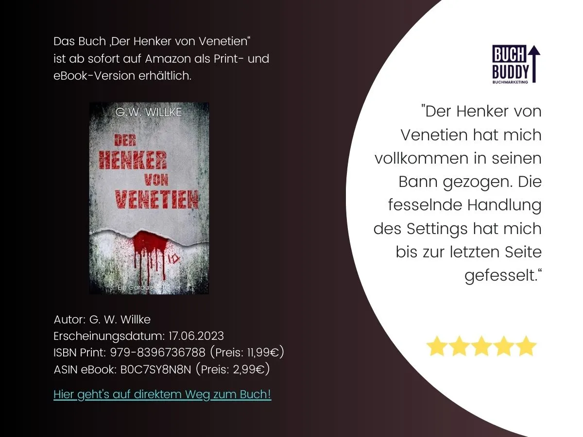 Der Autor G.W. Willke hat eine außergewöhnliche Fähigkeit, Spannung und Atmosphäre zu erzeugen. Mit einer meisterhaften Kombination aus geschickter Charakterentwicklung und zahlreichen überraschenden Wendungen entführt er seine Leser:innen auf eine nervenzerreißende Reise. "Der Henker von Venetien" ist ein Pageturner, der Thriller-Liebhaber und Fans von Regionalgeschichten gleichermaßen begeistern wird.