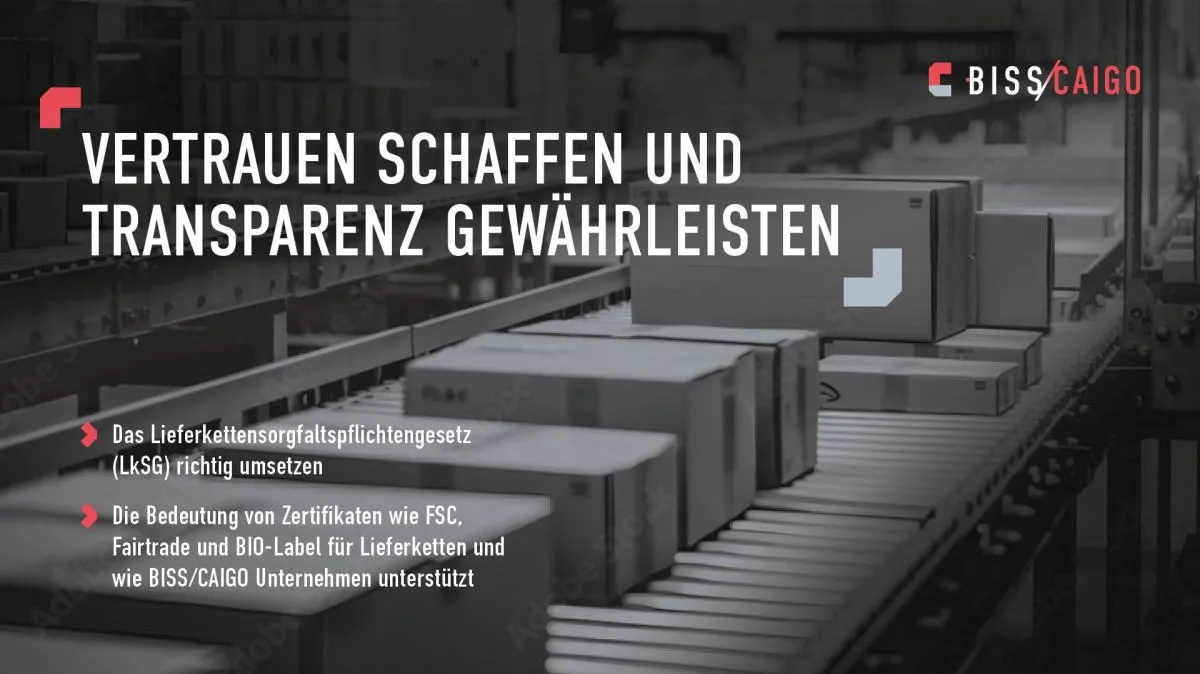 BISS/CAIGO unterstützt Unternehmen dabei, Zertifikate wie FSC, Fairtrade und BIO-Label in ihre Lieferketten zu integrieren. Die Software ermöglicht die Verfolgung von Zertifizierungen und die Einhaltung der damit verbundenen Standards entlang der gesamten Lieferkette.