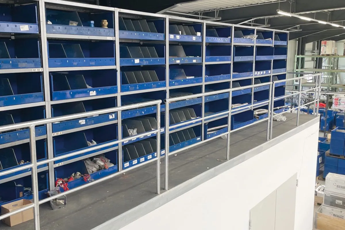 Was Hülsmann Haustechnik für die tägliche Arbeit an Materialien braucht, war über Jahre in Palettenregalen und einer zweigeschossigen Regalanlage untergebracht. Für den Neubau brauchte es nicht nur zusätzliche Lagereinrichtung, sondern auch eine praktikable Lösung, wie der Umzug ohne Unterbrechung der Materialversorgung vonstattengehen könnte. Die vielfältigen Komponenten in Kisten und Kartons vorübergehend zwischenzulagern, hätte die Monteure viel Zeit für die Suche nach den jeweils benötigten Einzelteilen gekostet. Mit Unterstützung von LagerTechnik-West konnte die Aufgabe bewältigt werden.
