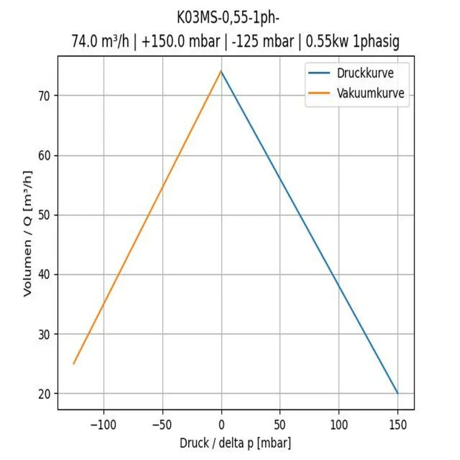 Der K04MS-0.75 - 0.90-3ph- Seitenkanalverdichter beeindruckt nicht nur mit seiner Leistung, sondern auch mit seiner Vielseitigkeit. Mit einer Frequenz von 50.0 Hz und 60.0 Hz ist er für unterschiedliche Netzfrequenzen geeignet, und sein breiter Betriebsbereich ermöglicht es, sowohl Vakuum- als auch Druckanwendungen mit Leichtigkeit zu bewältigen. Mit einem Vakuumwert von -150 mbar und einem Druckwert von 150.0 mbar im 50Hz-Betrieb, sowie einem Vakuumwert von 125 mbar und einem Druckwert von 125.0 mbar im 60Hz-Betrieb, ist dieser Seitenkanalverdichter für eine breite Palette von Anforderungen bestens gerüstet.