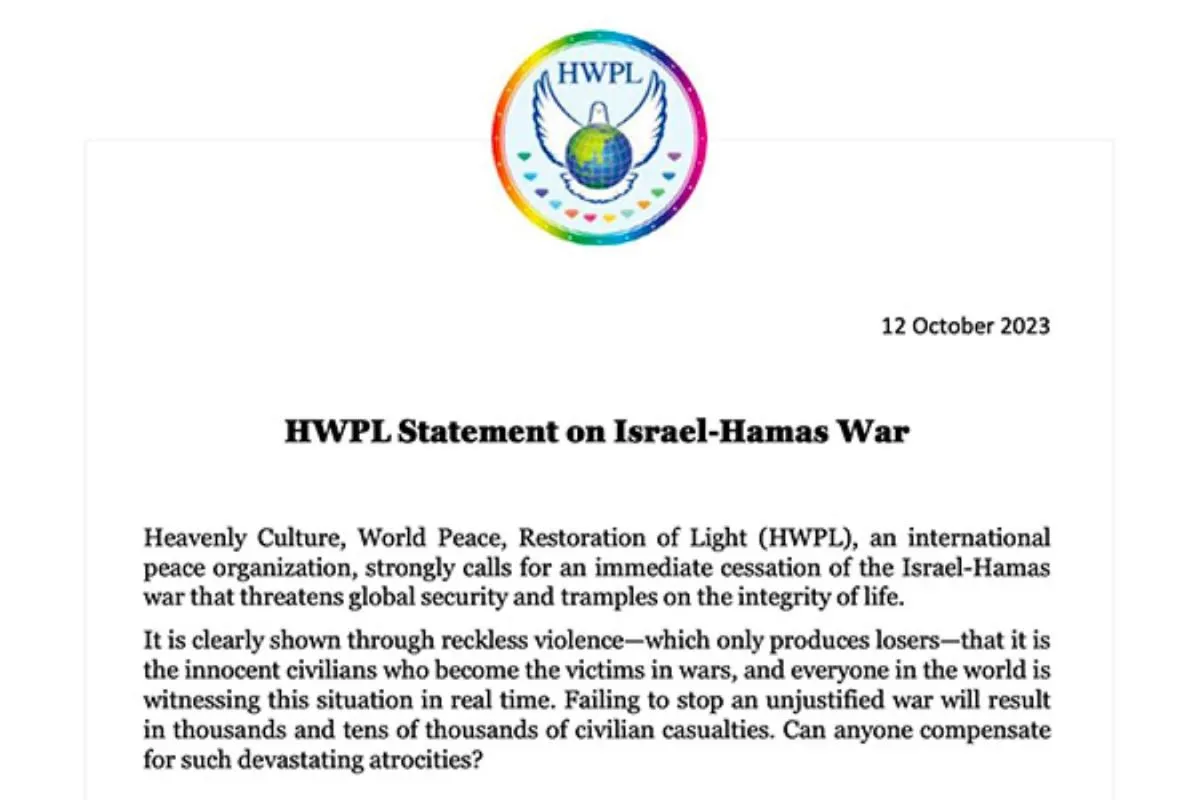 Am 12. Oktober veröffentlichte Heavenly Culture, World Peace, Restoration of Light (HWPL), eine internationale Nichtregierungsorganisation mit Sitz in Südkorea und Mitglied des Wirtschafts- und Sozialrats der Vereinten Nationen sowie der Stadtverwaltung von Seoul, ihre Stellungnahme zum anhaltenden Konflikt zwischen Israel und Hamas. Diese Erklärung markiert die dritte offizielle Stellungnahme von HWPL, die sich aktiv für den Frieden einsetzt, nach vorherigen Erklärungen zu Menschenrechtskrisen in Myanmar im März 2021 und zum Russland-Ukraine-Krieg im Februar 2022.